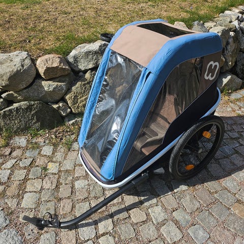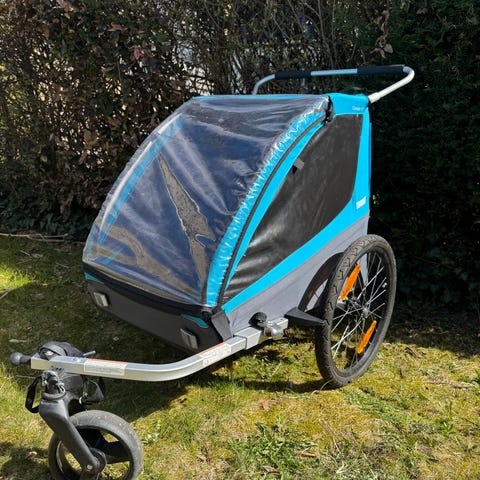 Perfekt för dagsutflykter bakom cykeln eller gå med barnen till förskolan i. Bra packutrymme bak. Sätet går även justera lutningen på (bra om barnen somnar)