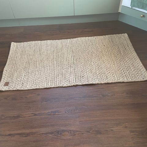 Ikea naturfärgad jutematta i rektangulär form. Grov, flätad struktur som passar i hall, kök eller andra rum där en slitstark matta önskas.