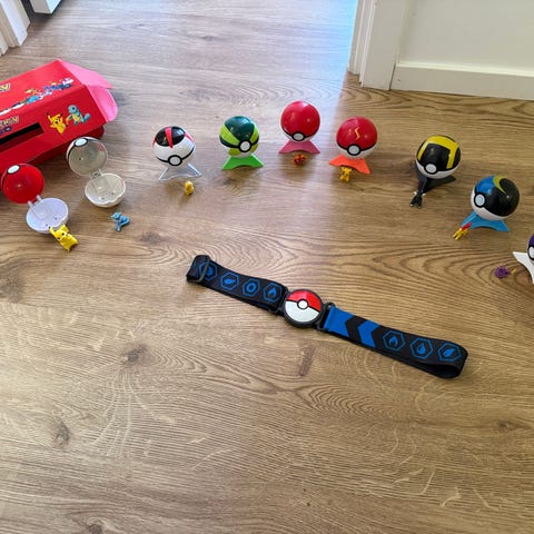 Pokémon pokéboll bältesleksaker med flera öppningsbara pokébollar i olika färger samt bälten med pokébollsmotiv. Setet innehåller även Pikachu-figur och ytterligare små Pokémon-figurer. Vissa bollar kan fästas i bältet och pokébollarna kan öppnas (dock endast de som är öppnade på bilden) för förvaring av de små figurerna. Lämpligt som lekset för barn som gillar Pokémon och rolllek.