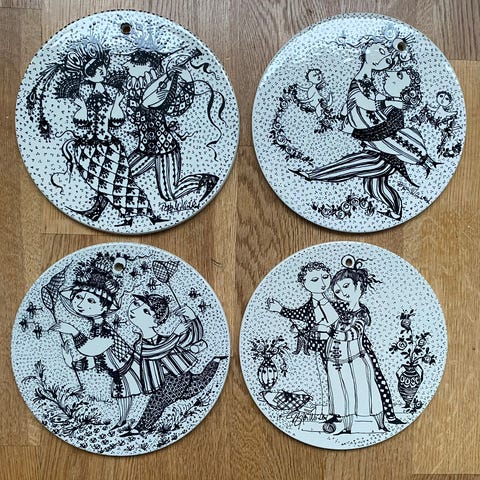 Gustafsberg tallrikar med svartvit dekor. Porslinstallrikar med tryckt motiv och text på framsidan samt stämplad märkning undertill. Passar som bruksföremål i kök eller som samlar- och prydnadsföremål.