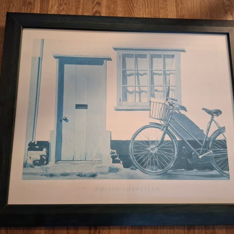 Till salu: en elegant konstposter av den kända brittiska konstnären Julia Matcham. Detta minimalistiska verk avbildar ett fridfullt havslandskap i pastellfärger.