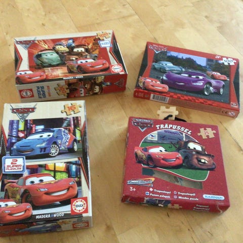 Fyra pussel med olika motiv och olika antal bitar. I pusslet Frozen finna tre olika motiv med 20 bitar, 36 bitar och 50 bitar, 30 kr.