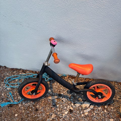 KTM barncykel med 12" hjul. Cykeln har orange ram med svarta och vita detaljer. Utrustad med stödhjul och styrstång baktill för att en vuxen ska kunna hjälpa till vid cykling. Handbroms fram och kedjeskydd. Passar mindre barn som ska lära sig cykla eller som första cykel efter springcykel.