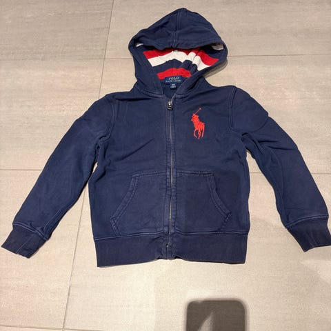 Polo Ralph Lauren huvtröja för pojke i storlek 5. Tröjan är blå och tillverkad i bomull. Modellen har huva, dragkedja framtill och två framfickor. Ärmen har tryckt Polo Ralph Lauren-text och muddarna vid ärmslut och nederkant är randiga. Passar som vardagströja eller som extra lager vid svalare väder.