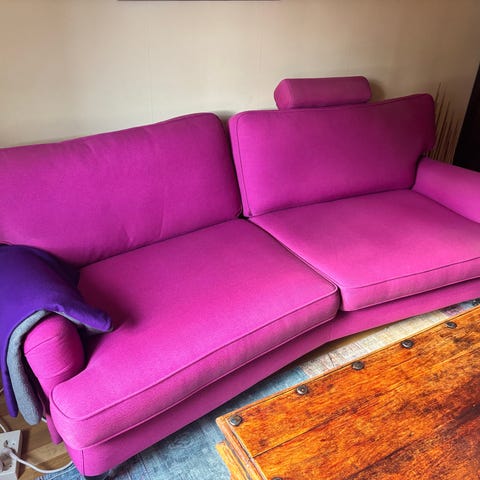 Slumpar bort min soffa byggd av Bröderna Anderssons, klädd i Svenskt Tenns tyg ”Vägen” och ett annat aprikosfärgat tyg på sittkuddarna.