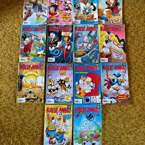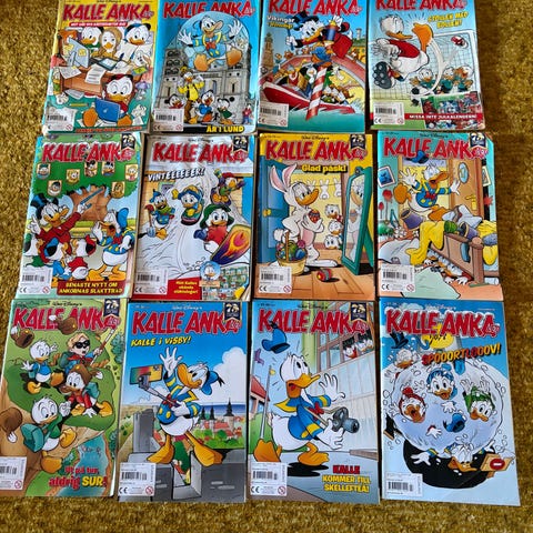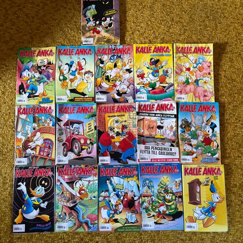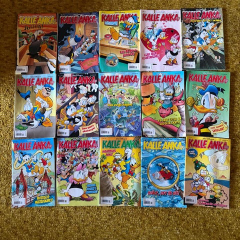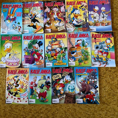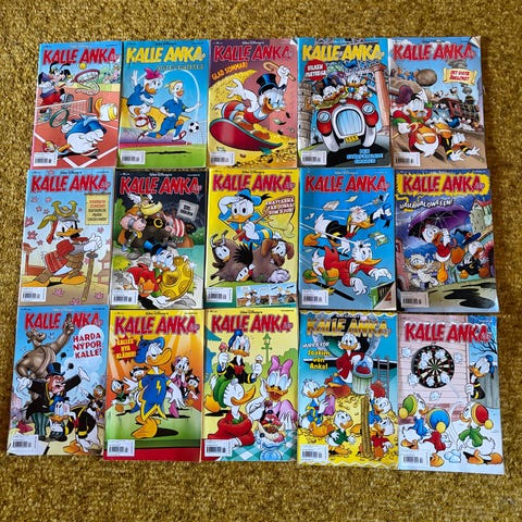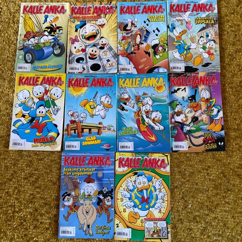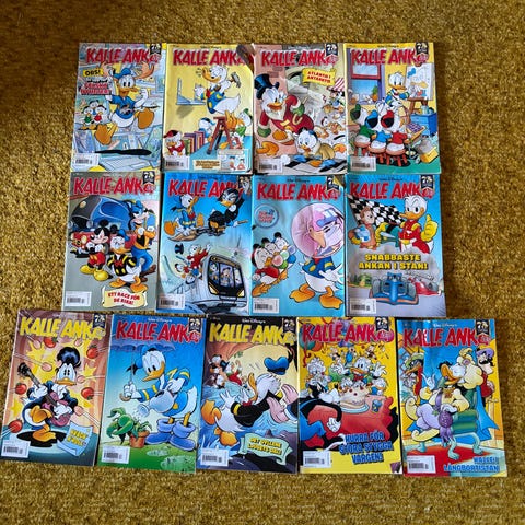 Kalle Anka serietidningar i ett blandat nummerpaket. Flera olika nummer och teman, bland annat sport, sommar, påsk och musik. Färgtryck med klassiska Disney-figurer på omslag och inlaga. Passar för läsning och samling för barn och vuxna som gillar serietidningar och Kalle Anka.