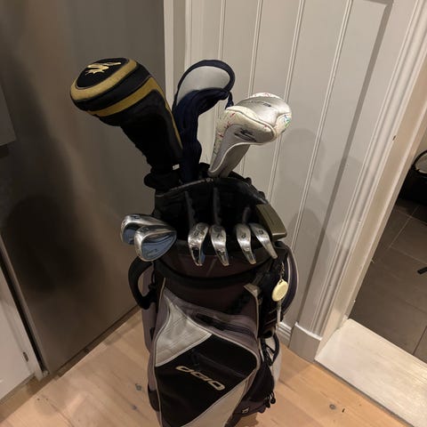 Golfbagen är sliten och ett av facken har hål i men fungerar som den ska, medföljer även över 20 st golfbollar av olika märken