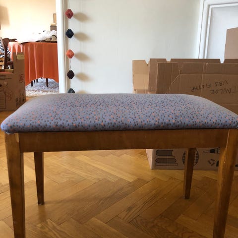 Pianopall i ljusblått klädsel, lock som går att öppna.