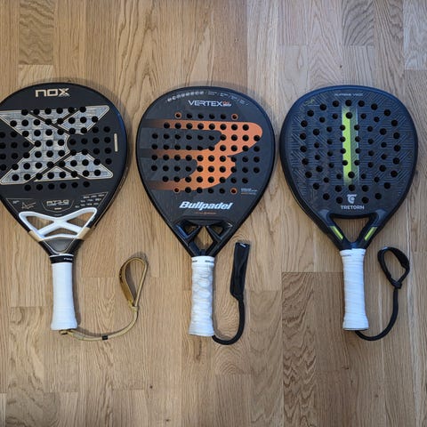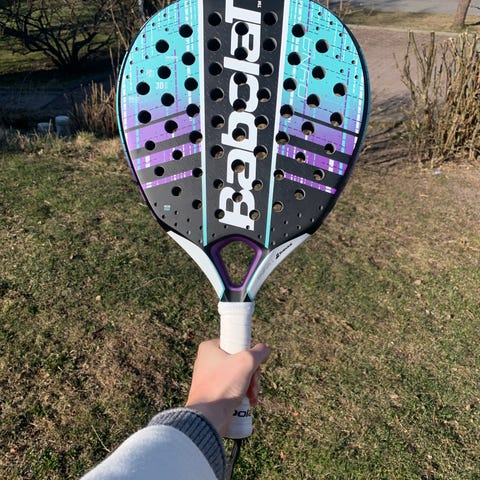 Babolat padelracket och padelväska samt Asics padelskor i svart färg. Två padelracket från Babolat med perforerad träffyta och handledsrem. Babolat padelväska med dragkedjefack och bärremmar, anpassad för att rymma racketar och tillbehör. Asics padelskor i svart med blå logodetaljer, snörning framtill och ovandel i textil/syntet för användning på padelbana.