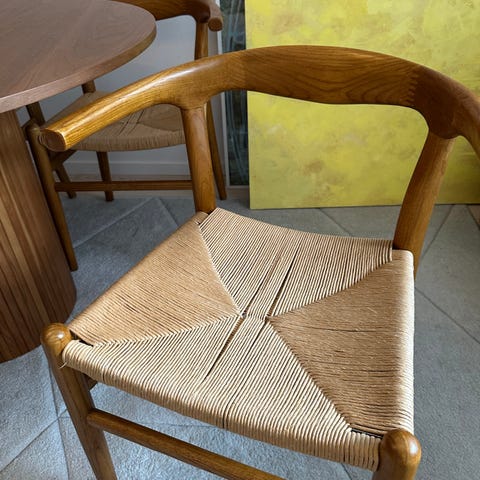 Två stolar av massiv alm med sits av vadderad rotting. Stolarna är stapelbara. Höjd 90 cm. Bredd 48 cm. Djup 54 cm. Sitthöjd 46 cm. Sittdjup 41 cm.