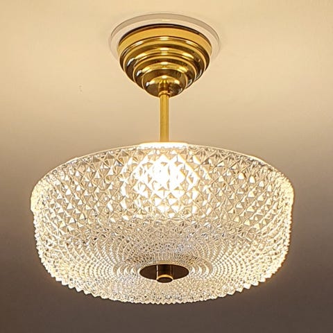 Takfäste och pendel i antik mässing, dropskärm i klart rutslipat kristallglas