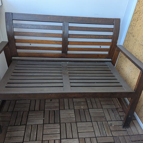 Utomhussoffa / bänk med utdragbara fotstöd från Rusta. Fotstöden går också att använda som bord om man tar bort dynan. När man inte använder fotstöden fungerar de även som förvaringslådor. Superpraktiskt och perfekt om man har mindre balkong. Säljes p.g.a. flytt. Använd en säsong, dynor har förvarats inomhus under vintern och överdrag har använts när bänken inte varit i bruk.