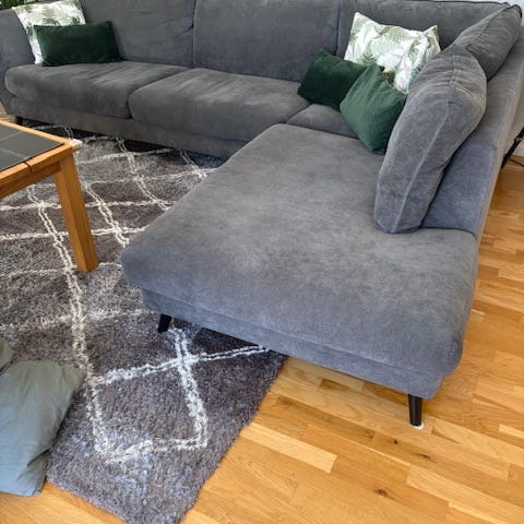 Lite mindre soffa men ändå plats för många. Perfekt i tonårsrummet. Divandelen går lätt att ändra från vänster till höger. Klädsel lätt att tvätta. Divandelen är 160 cm. Säljes på grund av flytt