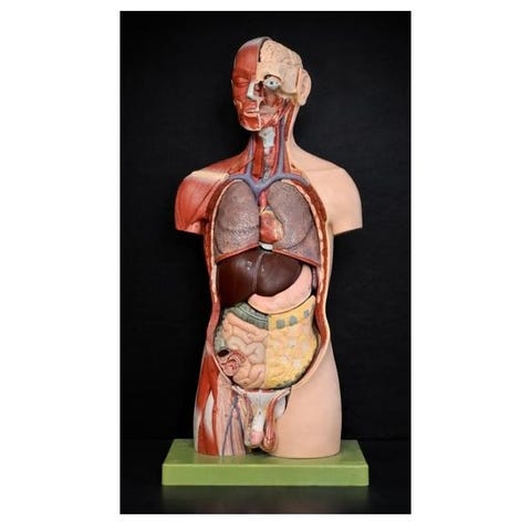 Anatomisk torsomodell av människa i plast. Modellen visar överkropp med inre organ som lungor, hjärta, lever, mage och tarmar. Flera organ är avtagbara för att visa underliggande strukturer. Monterad på en platta för stabil placering, lämplig för undervisning eller studier av människans anatomi.