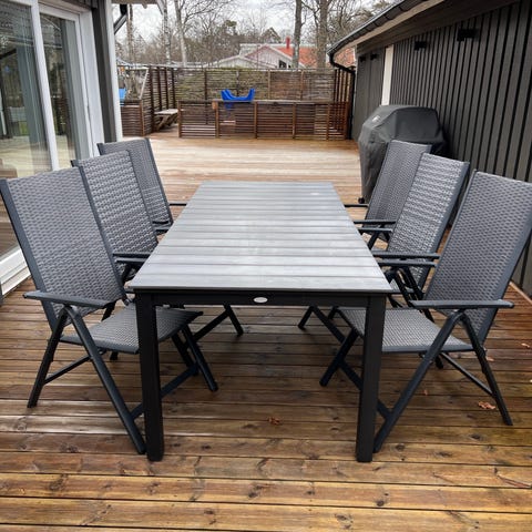 Matgrupp för utomhusbruk bestående av ett rektangulärt bord.