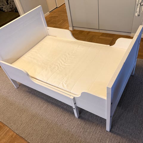 IKEA utdragbar barnsäng i grå färg. Sängen är justerbar i längd och kan förlängas i flera steg i takt med att barnet växer. Med ribbotten och låga sidor som ger viss avskärmning för barnet.