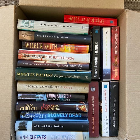 Mestadels deckare och thrillers, men även fantasy och drama finns. Letar ni efter något speciellt så hör av er, vi kan ha det 😊 Det finns många fler böcker än de som syns på bild.