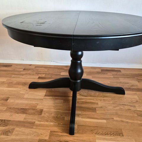Pianosvart målat matbord med utdragbar skiva som förvaras inuti bordet. Bordet har en diameter på 118 cm, och 157 cm i utdraget läge.