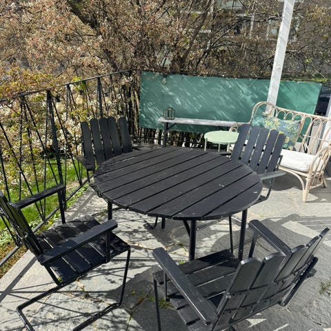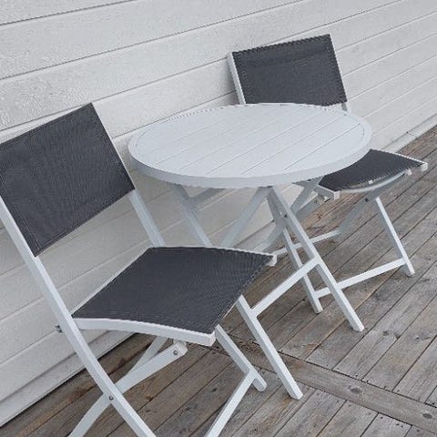 Cafeset med runt bord och två stolar. Bordsskiva och sitsar/ryggstöd består av svarta trälämmar monterade på svart metallstomme. Både bord och stolar är hopfällbara, vilket underlättar förvaring. Passar för uteplats, balkong eller trädgård.