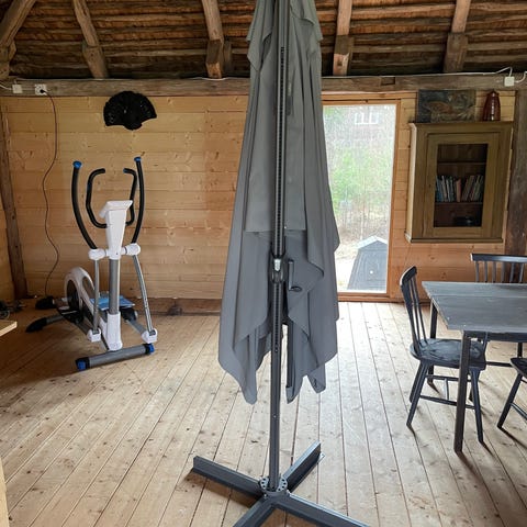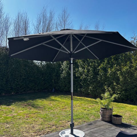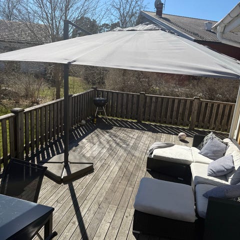 Rektangulärt parasoll i antracitgrå färg. Använd endast en säsong. Perfekt för balkong!