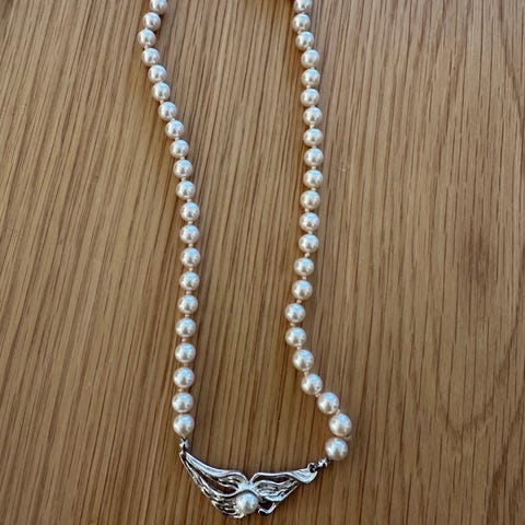 Pärlhalsband med runda äkta pärlor i jämn storlek längs hela halsbandet. Halsbandet har ett dekorativt lås i metall med infattad pärla. Passar som smycke till vardag och fest. Exakt längd, material och tillverkare framgår inte av informationen och kan mätas eller kontrolleras vid behov.