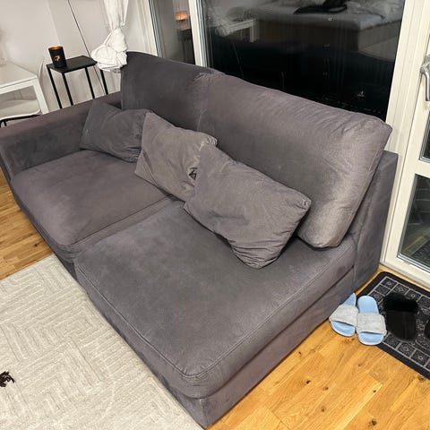 Fin grågrön soffa från IKEA med bäddmöjlighet och förvaring. Bild 5 gör färgen mer rättvisa. Diskreta vattenfläckar finns (se bild 6 & 7), men inget som stör helhetsintrycket. Kan troligen behandlas för den som vill.