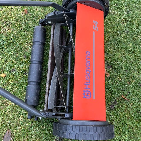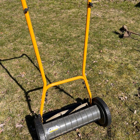 Stiga handgräsklippare säljes. Manuell cylindergräsklippare med hjul och skärcylinder framtill.