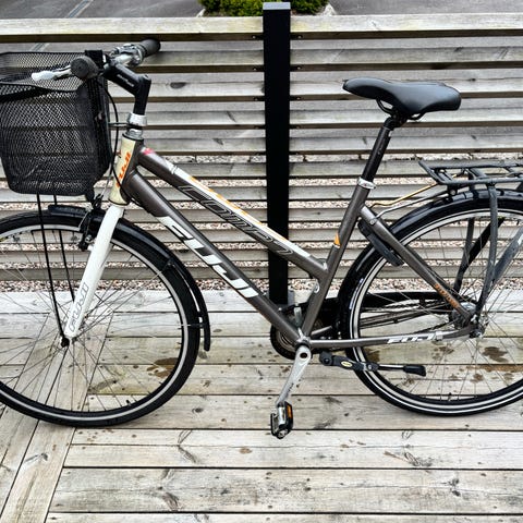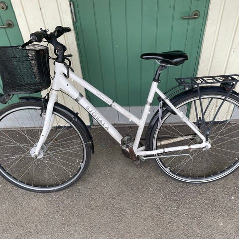Dam/herr. Vit pärlemolack. Hållare till vattenflaska. Servad o justerad 2025, Nya reflexer och bak- och framlyse, Nytt framdäck m slang nov 2025 (495:-), Aria cykelväska, pakethållare ingår men inte monterade. Riktpris ca 5.500 (se annons på sista bilden). Fast Abuslås med två nycklar.