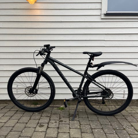 Cykeln är utrustad med framdämpning, skivbromsar, grovmönstrade däck, flaskhållare och bakskärm. Den känns stabil, smidig och bekväm att cykla på.