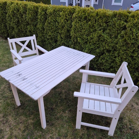 KWA matgrupp för uteplats bestående av rektangulärt bord och fyra stolar. . Möbelgruppen är i vitmålat trä och är avsedd för utomhusbruk, exempelvis altan eller trädgård. Stolarna har ribbad rygg och sits samt armstöd. stolarna är ställbara. På bilderna syns även lösa dynor i mörkblått tyg som kan ingå om så önskas.