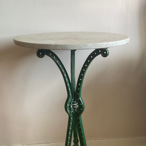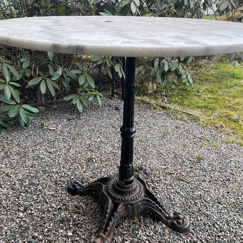 Runt cafébord med marmorskiva och ben i gjutjärn.