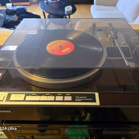 Audio Technica skivspelare för uppspelning av vinylskivor. Utrustad med tallrik för skiva, tonarm och dammskydd i plast. Passar för anslutning till stereoanläggning eller förstärkare med lämplig ingång. Modellbeteckning och exakta tekniska specifikationer framgår inte av underlaget.