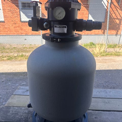 Poolfilter med sand (medföljer ej). Backspolning, timer, tryckmätare m.m.