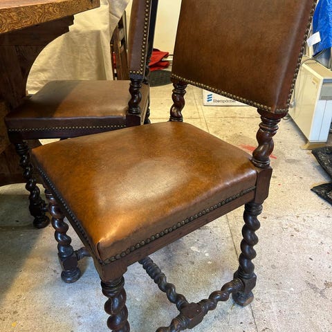 Detta är 4 st stolar i nyrenässansstil, troligen från 1800-talets senare del, med trästomme och röd sits