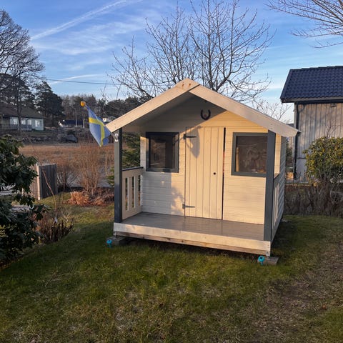 Liten lekstuga med plåttak för mindre barn. Bredd 138, djup 130, höjd 148.