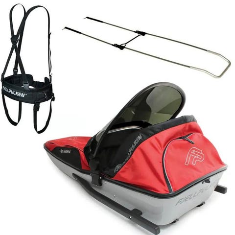 Fjellpulken, barnpulka med skakel och dragbälte. Vindruta som skyddar barnet för vind och nederbörd. Rutan kan ställas i det läge som passar för barnet. Ryggstöd. Fint skick.