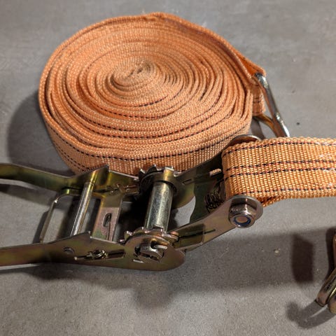 Spännband enligt bild, 3 st oöppnade paket med band och spännare, samt tre extra oanvända band. Till släpet, verkstan, garaget eller liknande.