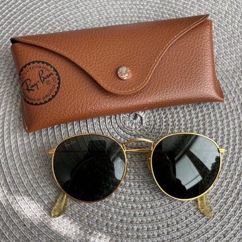 Ray-Ban runda solglasögon för unisex. Modellen har tunn guldfärgad metallbåge med runda, mörka glas. Skalmarna är smala med transparenta skalmändar. Solglasögonen levereras med Ray-Ban-fodral enligt bild. Passar som klassiska runda solglasögon för vardagsbruk och utomhusaktiviteter.