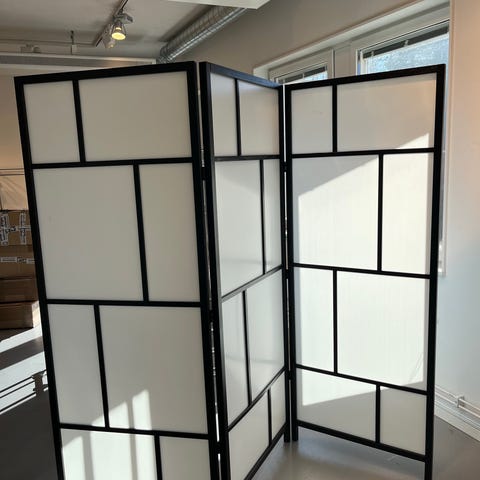 IKEA rumsavdelare i vikbar modell med svart ram och vit fyllning i rutmönster. Passar för att dela av rum eller skapa avskärmning i exempelvis vardagsrum, sovrum eller kontor.