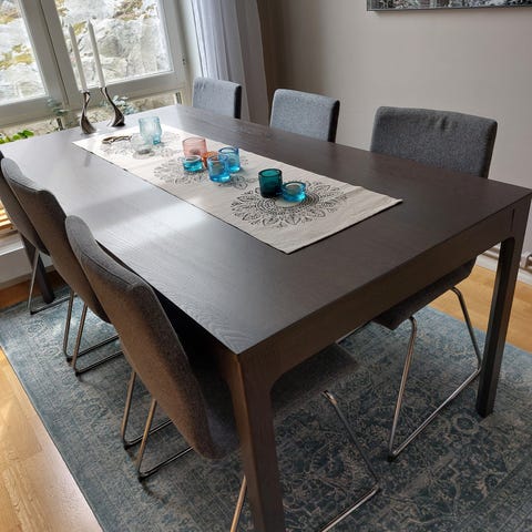 Matbord med 6 st omklädda stolar i grå tyg i fin skick. Bordet har en granit platta. Slipad och oljad likaså skåpet .