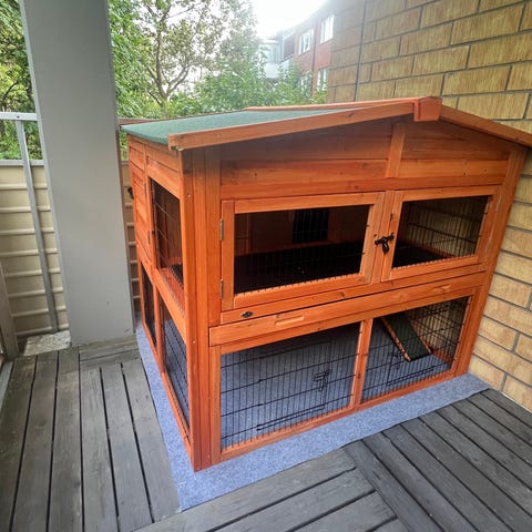 Säljer två rejäla kaninburar/hagar. Den lägre av dem i brunt behöver få taket fixat då det har börjat lossna från pappen, den större är i bra skick! Säljer också en kaninbur som ses på bild 3, även galler som sätts ihop till en fin utehage. Vi har haft de två större burarna fästa i varandra + utehagen vilket gör att det blir mycket utrymme att röra sig på. Har även en resebur, vattenflaska, kloklippare, borste, två koppel med selar och hopphinder. Köps allt i ett paket kostar det 2000.