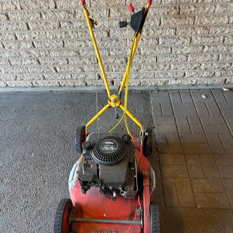 Klippo Pro gräsklippare för bensindrift. Modellen har röd klippkåpa och gula handtag. Utrustad med fyrtaktsmotor och framhjulsdrift Passar för klippning av villagräsmattor och liknande ytor.Ställbar höjd lättstartad. 9021 .