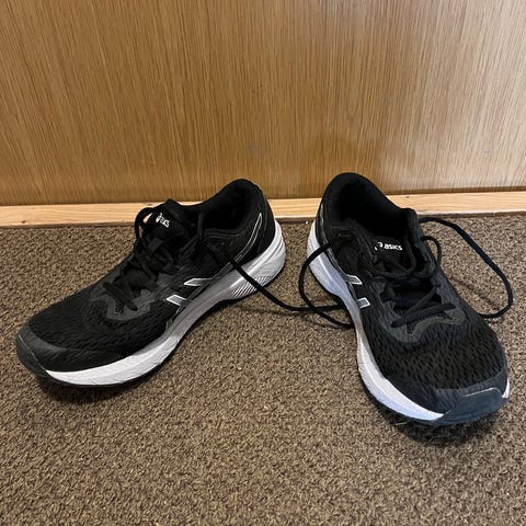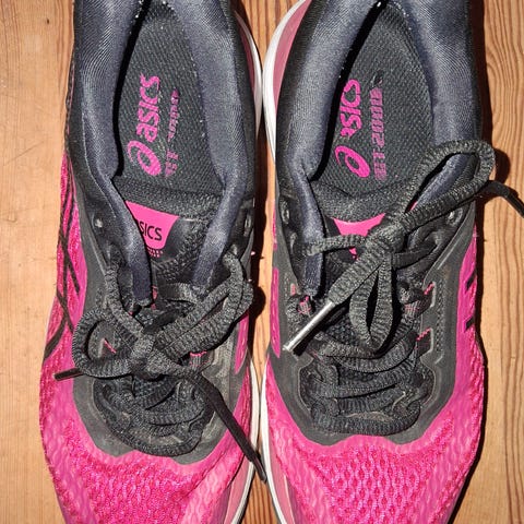 Asics T892N löparskor i blå färg. Skorna har ovandel i syntetiskt material och yttersula i gummi. Europeisk storlek 41,5 (etikett 41.5, 26 cm). Modellen är avsedd för löpning och andra träningsaktiviteter. Snörning framtill och vadderad häl för stabil passform.
