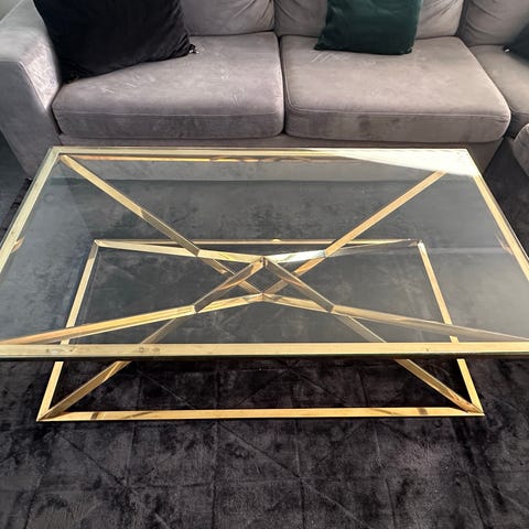 &tradition soffbord och sidobord i glas och metall formgivna av Aage Petersen. Borden har skivor i klart glas och underrede i metall med korslagda,