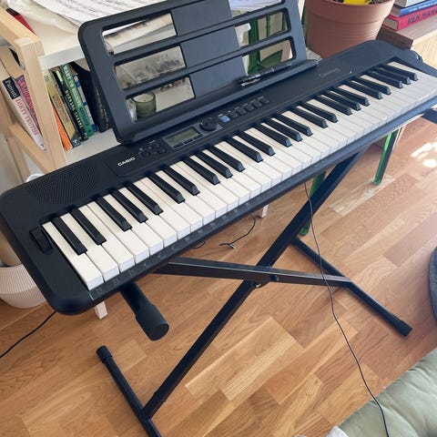 Casio LK-265 digitalpiano med 61 fullstora tangenter i svart utförande. Modellen har inbyggd display och kontrollpanel med olika funktioner och inställningar. På baksidan finns flera anslutningar, bland annat hörlursuttag, strömanslutning och andra ljud- och styranslutningar. Tangentbordet drivs via nätadapter. På bilderna syns även ett par hörlurar samt ett X-format keyboardstativ som kan användas för att placera pianot i spelhöjd. Produkten lämpar sig för hemmabruk, övning och enklare musikspel på elektroniskt tangentbord.