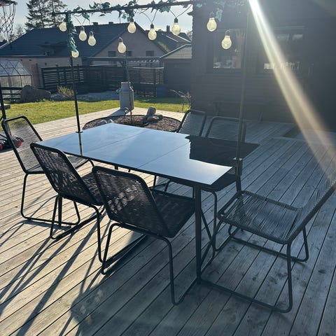 Om man vill ha med bordet (också Hillerstorp) så får man det gratis vid köp av stolarna. Det var väldigt slitet så vi slipade och betsade det förra året, se bilderna på bordet.