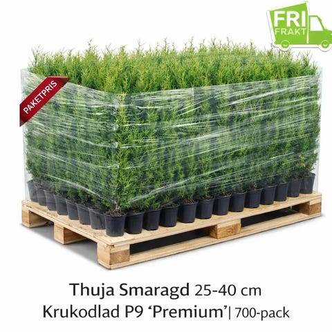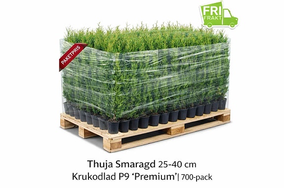 Nu erbjuder vi ett komplett 700-pack av Thuja Smaragd 25-40 cm, krukodlad i P9, Premium-kvalitet.