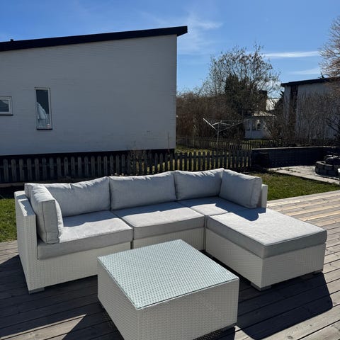 Dynorna till loungesoffan finns bevarade i big bag påse, de är solblekta men går att använda.