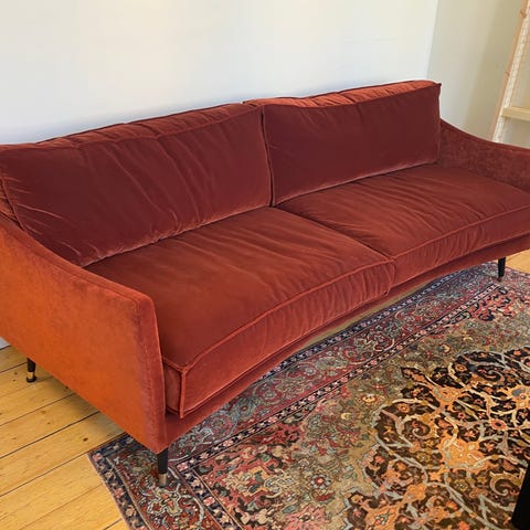 Orange kvalitets soffa i behov av omklädsel.