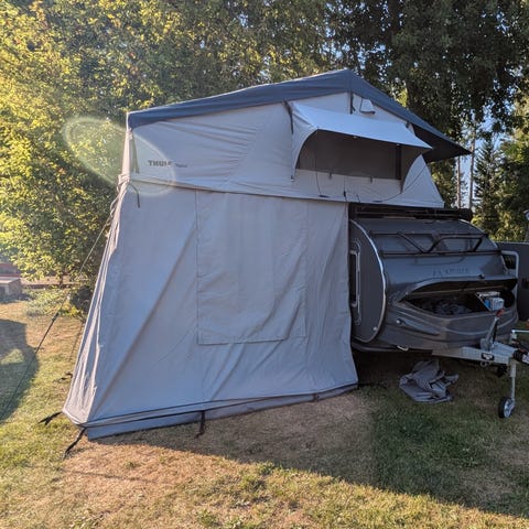 Efter två säsonger och ca20 tältnätter säljer vi vårt taktält med markis och skoförvaring